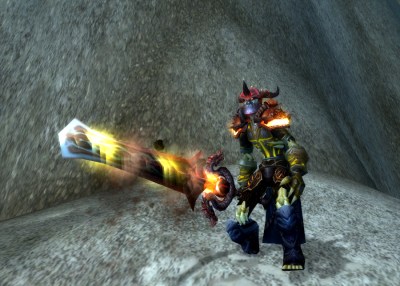 I’ve actually delayed this post for about three weeks, which is how long my warrior has had possession of the Tentacle Rape sword. I’m not even sure why I went into LFR with my warrior, probably helping a friend roll on things (I know, it’s bad). Of course, Deathwing drops this sword, and of course, the tank wins and everyone sighs in frustration and leaves. Now I have made a habit of going afk during loot rolls. It just takes THAT long to get things done.All the melee users had left and the very nice tank traded me this sword! And thus concludes my almost six month long hunt to collect all of Deathwing’s weapons (for no reason at all). (Also, my rogue managed to collect his useless dagger)