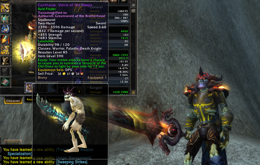 So as I had mentioned before, if I ever won this sword on either my DK or Warrior I would respectively switch specs to Unholy/Arms. So I respecced to Arms, worked out the nuances and it seems my warrior does fairly well managing to maintain about 24k in half tanking gear.