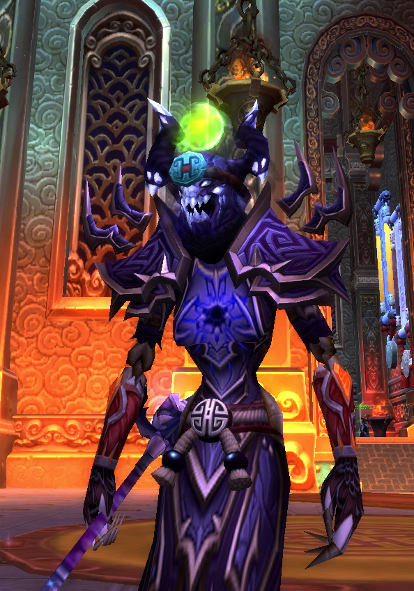 I was peeking around the loot tables of the bosses in Heart of Fear and saw the Warlock T14 lookalike helm and HAD to use it! A chance to look sha-like before the actual helm is released with the Terrace!