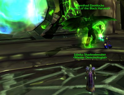 I made some healthy attempts at Kanrethad tonight! My main issue, and what seems to be the crux of success or failure to this encounter were the dreaded dastardly Felhunters. My previous attempts a couple days ago were fraught with error. I let Bobby the Pitlord (oh CRAP I forgot to take a final screenshot of my best friend!) get in FRONT of the Felhunters on my failing attempts, and tonight what I did was set him on passive and move him BEHIND where they spawn.